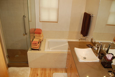 The bathroom is truly a work of art. It is outfitted with Hardwood floors, beautiful free-form porcelain dual sinks with artistic faucets, a deep two-person bathtub, a fully glass enclosed two-person shower, and a separate clothes washer and dryer conveniently located in the closet. Thick colorful towels and floor mats compliment the bath.